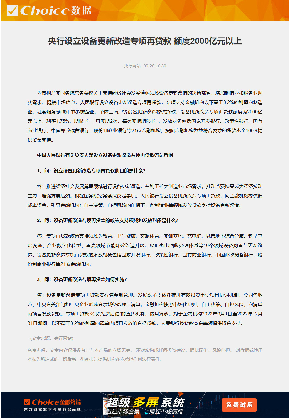 9月28日,根据中国人民银行网站信息,为贯彻落实国务院常务会议关于支持经济社会发展薄弱领域设备更新改造的决策部署,增加制造业和服务业现实需求、提振市场信心,人民银行设立设备更新改造专项再贷款,专项支持金融机构以不高于3.2%的利率向制造业、社会服务领域和中小微企业、个体工商户等设备更新改造提供贷款。设备更新改造专项再贷款额度为2000亿元以上,利率1.75%,期限1年,可展期2次,每次展期期限1年,发放对象包括国家开发银行、政策性银行、国有商业银行、中国邮政储蓄银行、股份制商业银行等21家金融机构,按照金融机构发放符合要求的贷款本金100%提供资金支持。