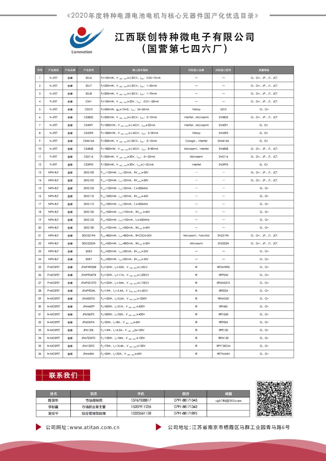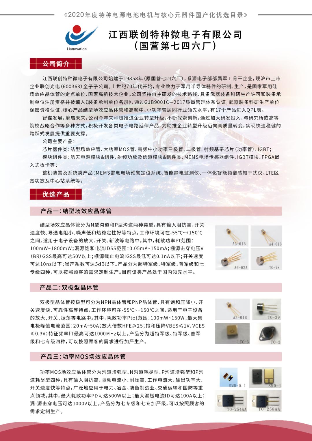 恭喜集团下属单位江西联创特种微电子有限公司(国营第七四六厂)入编《2020年度特种电源电池电机与核心元器件优选目录》