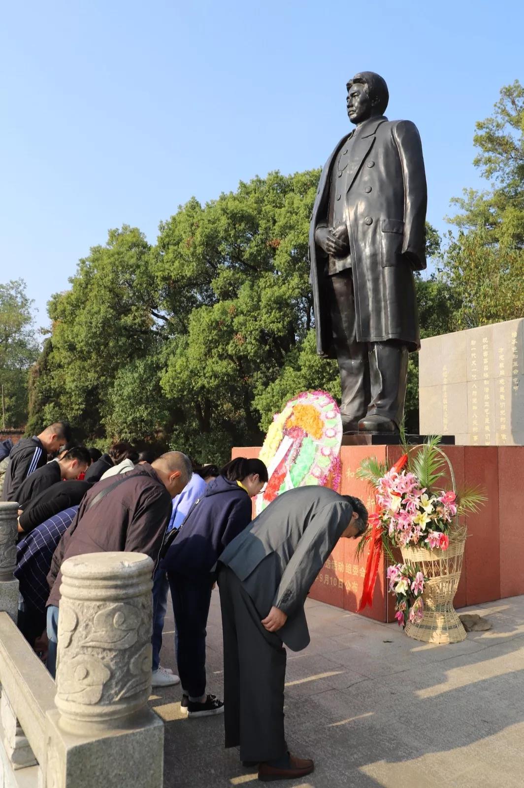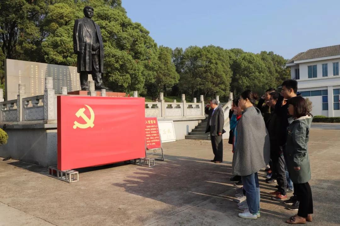 在方志敏铜像前、在鲜红的党旗前,全体党员佩戴党徽,庄严举起右拳,重温了入党誓词,并敬献了花圈,肃立默哀。
