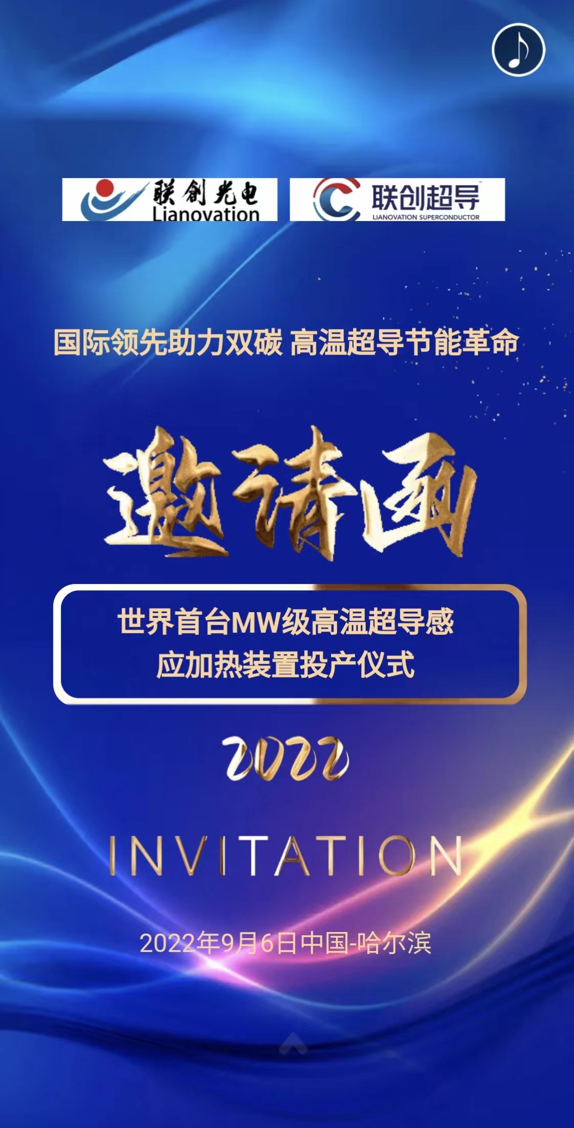 十年磨一剑,一朝试锋芒!联创高温超导历经近十年的科技长投,倾心打造的高温超导感应加热设备,超导设备于今年3月完成验收,联创高温超导即将开启商用的新征程。我们在求真创新、产业报国的道路上,离不开诸位的鼎力协助,为感谢诸位对联创超导的信任与支持,公司将于2022年9月6日在哈尔滨举办“MW级高温超导感应加热装置投产仪式”。届时特邀嘉宾、行业专家、公司高管将介绍设备作业情况及公司高温超导设备的发展战略,这将是高温超导近期最受瞩目的重要盛会。为此,我们诚挚邀请您来参与我们的盛会!