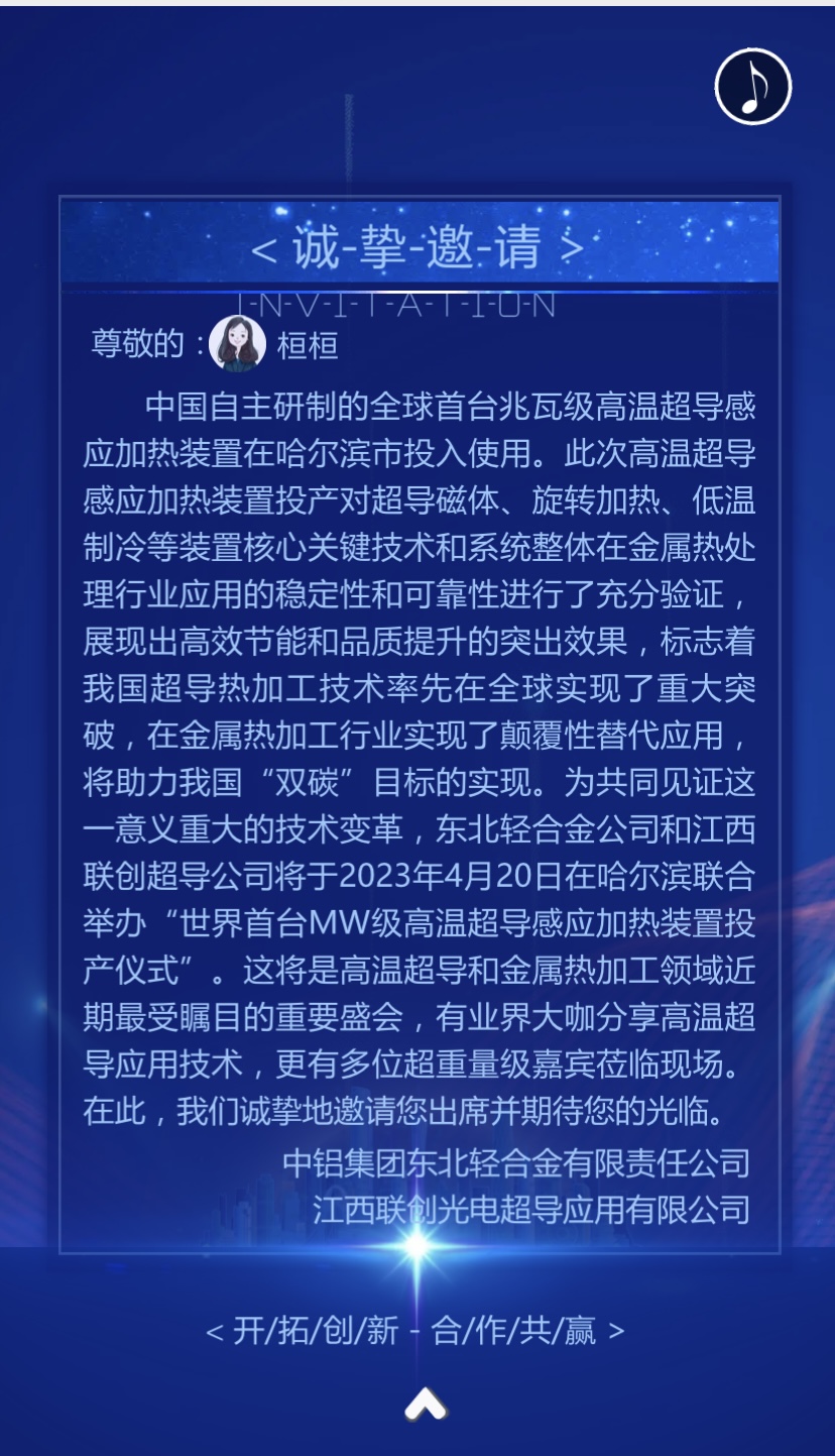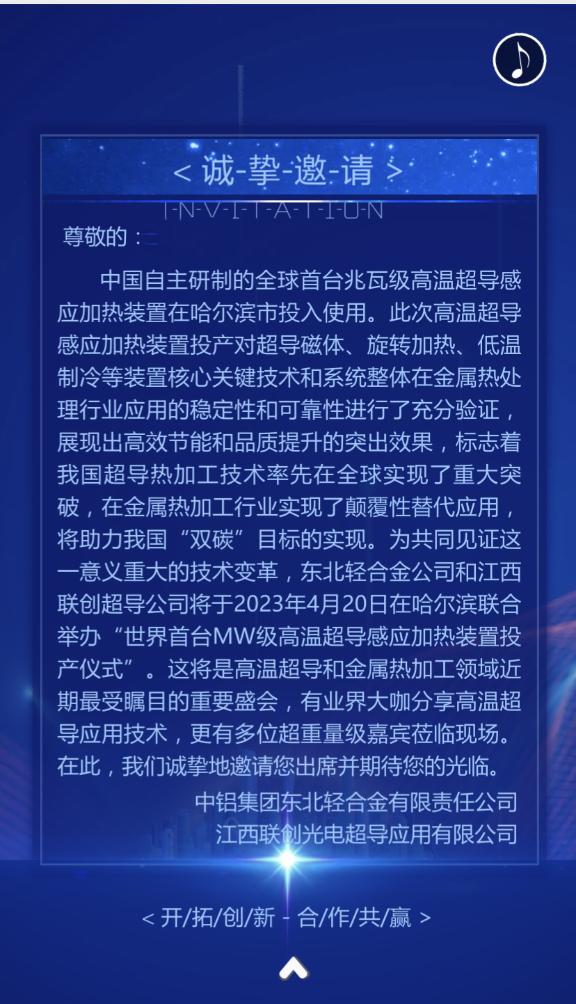 世界首台MW级高温超导感应加热装置投产仪式邀请函