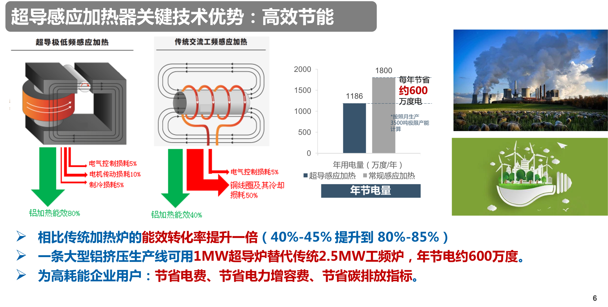 高效节能是这种加热方法的最突出优势。传统的工频炉,大量的热能消耗在产生磁场的铜线圈上,并没有注入工件体内,因此加热效率只有不到50%。超导感应加热,由于其零电阻特性,产生强磁场只消耗些低温制冷损耗,加上机械传动损耗在内,总损耗不会超过20%,因此可以将加热能效大幅提升到80%以上。这就意味着一台1mw的超导炉可以替代掉传统2.5兆瓦的工频炉,一年运行可为客户节省600万度电,除此之外,还能节省电力增容费,和未来的碳排放指标。