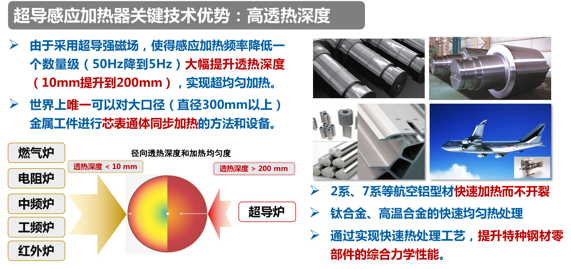 高温超导感应加热技术是金属热处理领域的变革性技术创新,是金属热加工,热处理领域的一个颠覆性产品。它有望将传统工频感应炉的能效转化率再提升一倍,即碳排放再减一半。另外,传统工频炉照比燃烧炉,并没有解决透热深度差的问题。工频感应炉的透热深度只有7mm。