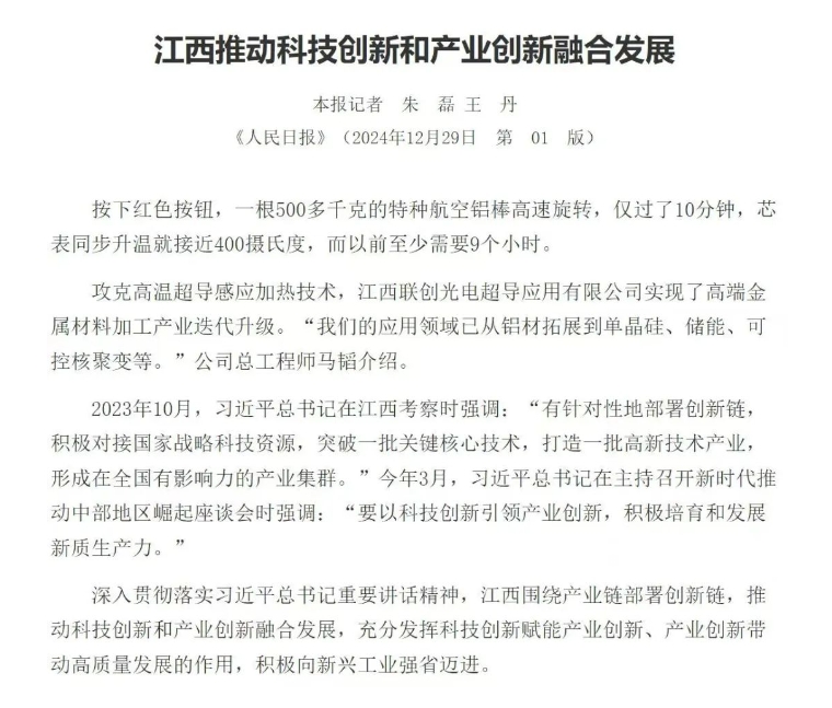 攻克高温超导感应加热技术,江西联创光电超导应用有限公司实现了高端金属材料加工产业迭代升级。“我们的应用领域已从铝材拓展到单晶硅、储能、可控核聚变等。”公司总工程师马韬介绍。