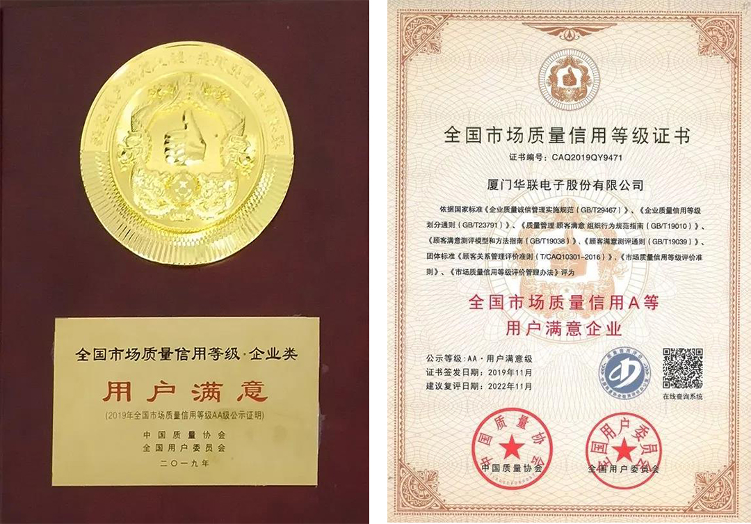 近日,中国质量协会、全国用户委员会在珠海联合举办“2019满意中国年会”,会上发布2019年全国市场质量信用A等用户满意企业名单。名单依据《企业质量诚信管理实施规范(GB/T29467)》、《企业质量信用等级划分通则(GB/T23791)》等多项国家标准选评,厦门华联电子股份有限公司成功入选,公示等级为AA级。这已是华联电子第四次获得本项殊荣。