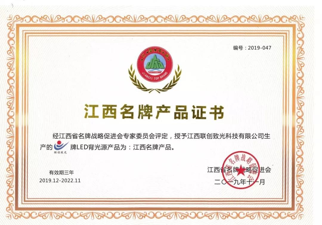 11月26日,江西省名牌战略促进会第二届理事会三次会员代表大会暨2019江西名牌产品发布会在九江举行。发布会上,全省285个产品获“江西名牌产品”证书并集中进行授牌。江西联创致光科技有限公司生产的“联创致光”牌LED背光源产品通过江西名牌战略促进会审定,荣获“江西名牌产品”称号。