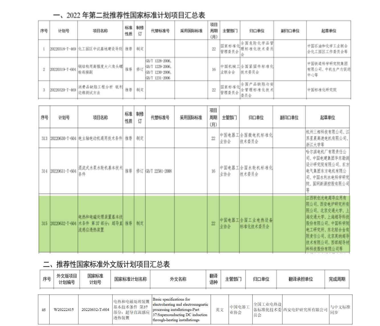 近日,国家标准化管理委员会(以下简称“国标委”)发文下达2022年第二批推荐性国家标准计划及相关标准外文版计划,我集团旗下子公司-江西联创光电超导应用有限公司(以下简称“联创超导”)作为目前全球首家兆瓦级超导感应加热装置的生产单位,牵头申报的《超导直流感应透热装置》推荐性国家技术标准,获批立项,正式进入标准草案起草阶段,其作为全球领先的技术,将同步翻译英文版标准。